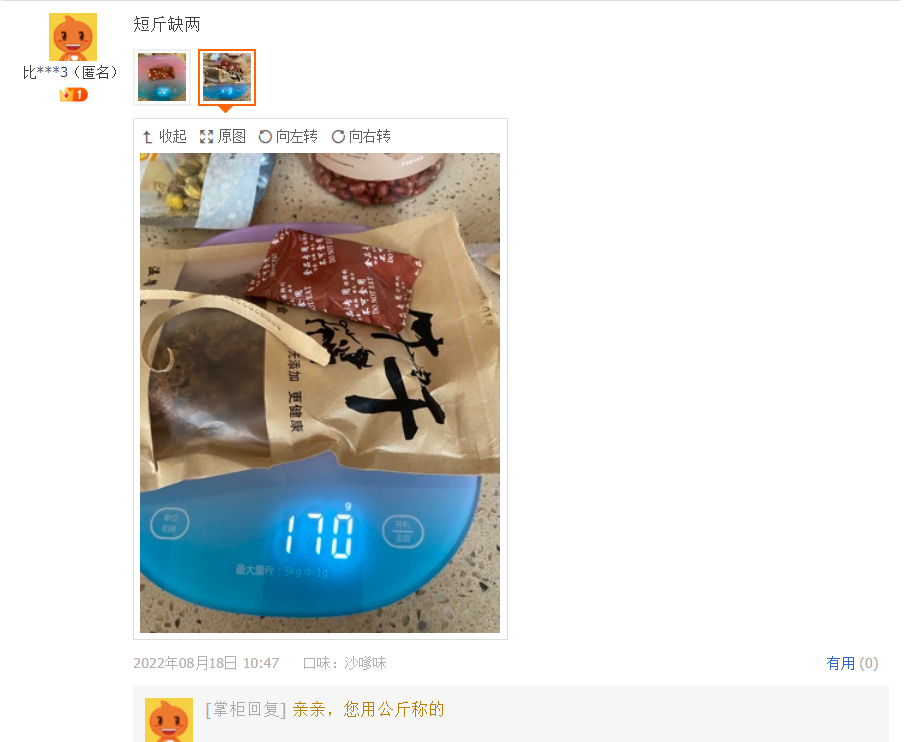 店铺街上重量是500g,净重400g,而给的图片上净含量是称重销售。再看看评论区的买家评论,卖家的回复也是没有谁了吧。