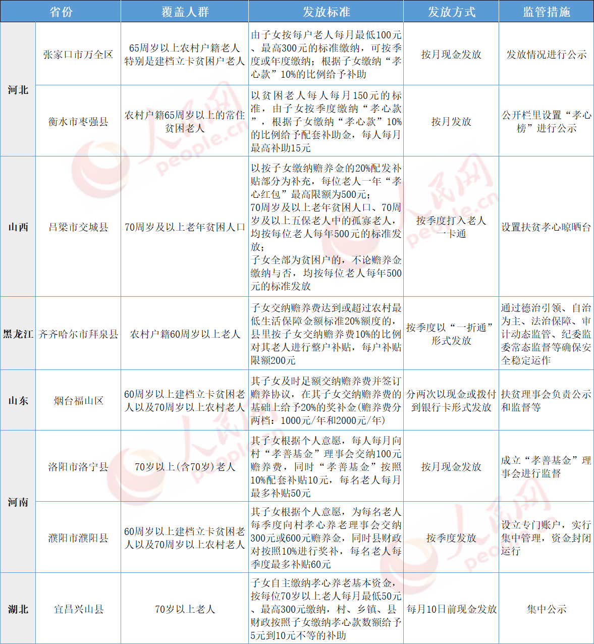 如,2019年以来,河北张家口市万全区面向65周岁以上的农村户籍老人,特别是建档立卡贫困户老人设立“铁建阳光”孝心养老公益金;黑龙江拜泉县采取“一交纳、三补贴”方式创新实施孝心养老扶贫模式,该模式不仅仅针对贫困家庭60周岁以上的老人,还扩大到所有农村户籍60周岁以上的老人;河南洛阳洛宁县为引导子女赡养老人尽孝心,专门设立了“孝善基金”,覆盖全县70岁以上(含70岁)的老人等。