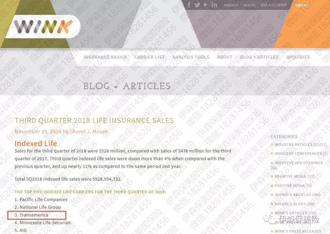 Wink, Inc.是美国一家独立收集指数保险公司销售量的权威。他掌控了47家保险公司的销售数据,总共代表业界99%的销售量,并且每季在美国的各大保险新闻网站发布销售情况。以下的排名是由近期6季的平均值作为平均排名: