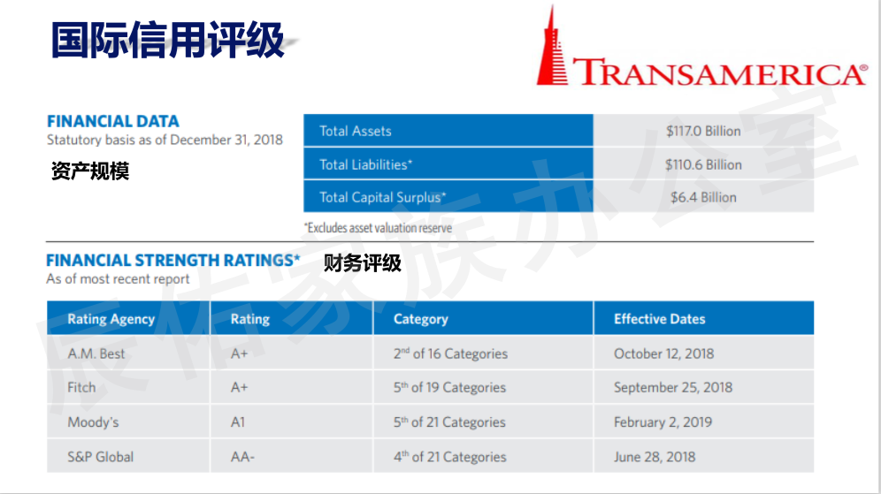 TransAmerica(泛美人寿保险公司)主要市场在美国、加拿大、荷兰、英国、香港等10余个国家及地区经营。其在财务,信誉评估方面都达到基本稳健甚至“债务偿还能力强”的评级级别。综合实力在世界保险公司中也是首屈一指。在几家评级机构都拥有很高的评级。