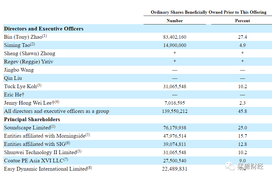 美股IPO前,声网(Agora)创始人赵斌持股为27.4%,为大股东;Soundscape持股为25%;晨兴资本持股为15.7%;SIG持股为12.8%;顺为资本持股10.2%;Coatue PE Asia XVI LLC持股为9%;Easy Dynamic International Limited持股7.4%。