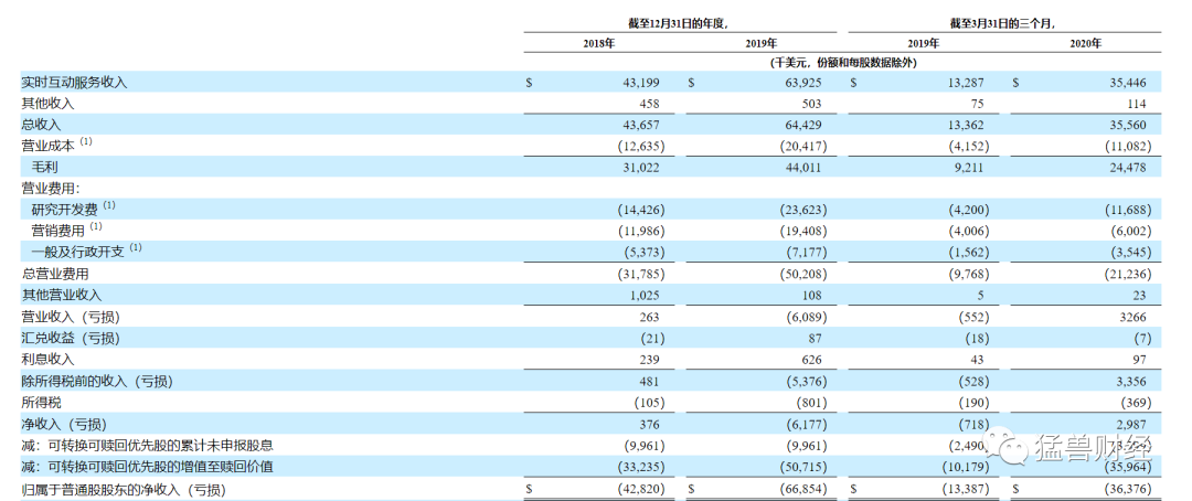 声网(Agora)2018年、2019年净利润分别为37.6万美元和亏损617.7万美元。2020年一季度净利润为298.7万美元,同比扭亏为盈。