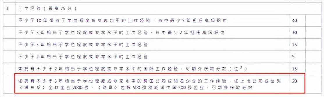 5.优才计划综合计分制的调整,针对工作经验方面,如拥有不少于3年相当于学位程度或专家水平的跨国公司或知名企业的工作经验,