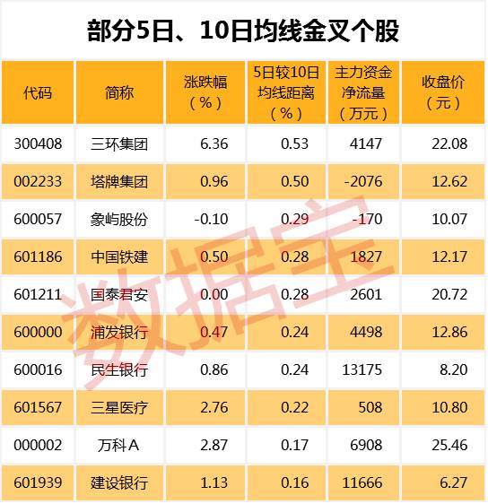 等个股的5日均线较10日均线距离最大,分别达0.53%、0.50%、0.29%。