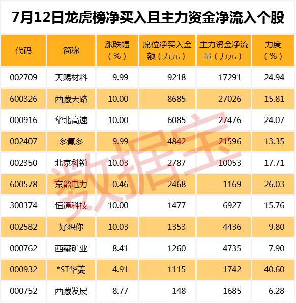 从盘口资金流向来看,主力资金净流入超千万且龙虎榜净买入个股共有11只,其中