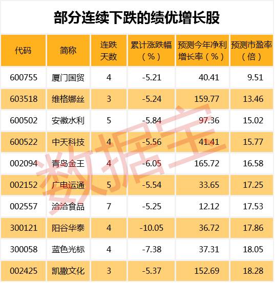 连跌股票中,一些低估值高增长股票值得关注。数据宝统计显示, 261只连续下跌且累计跌幅超过5%个股中,14只个股按照机构预测(5家以上机构预测)的今年年度净利测算市盈率低于20倍且净利正增长,