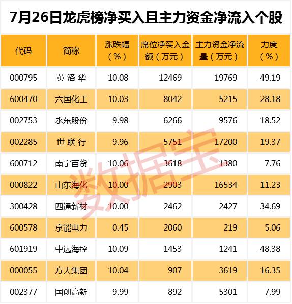 从盘口资金流向来看,主力资金净流入超千万且龙虎榜净买入个股共有10只,其中
