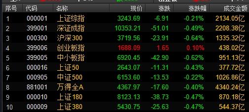 沪指终止五连阳,创业板小幅收涨。截止收盘,上证综指下跌0.21%报收于3243.69点;深证成指下跌0.49%报收于10353.21点;创业板指上涨0.10%报收于1688.09点。今日两市成交4340亿元。包含新股在内,涨停个股30只,跌停个股2只。