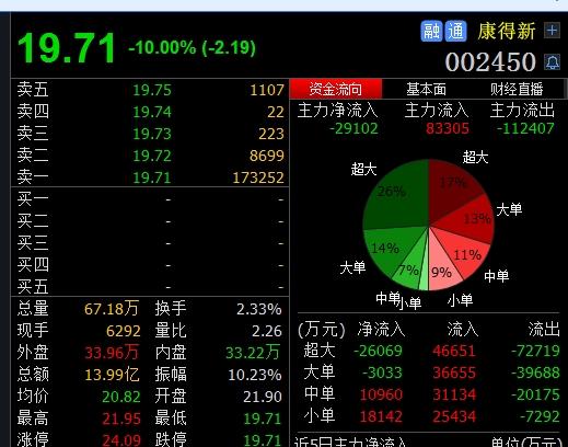 3、白马股康得新盘中极速闪崩,一直崩到跌停。打开万得股票APP回顾一下,康得新开于21.90元,最高上摸到21.95元,之后迅速闪崩,一直崩到跌停板的19.71元。