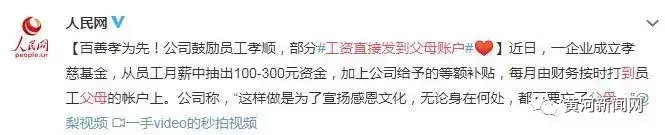 最近,微博上一段视频挺有意思。一家公司成立孝慈基金,员工月薪抽一部分,公司等额补贴,比如员工出300,公司财务贴300,这样父母可以收到600元的孝顺金。