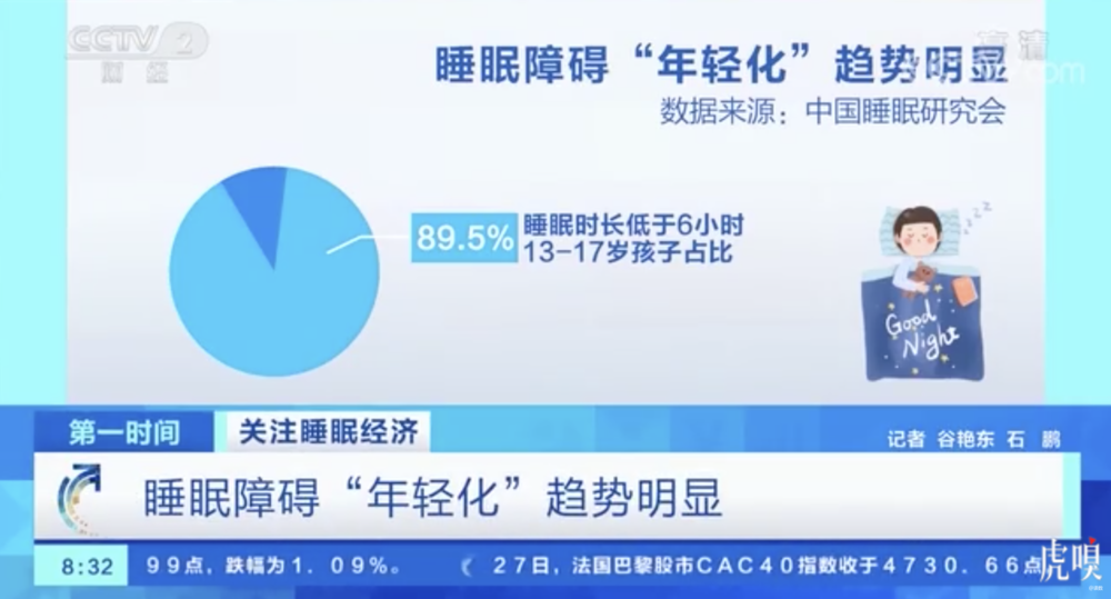 @虎嗅【全国超过3亿人存在睡眠障碍,褪黑素销量大涨】数据显示,目前,全国有超3亿人存在睡眠障碍,其中,四分之三在晚上11点以后入睡,三分之一要熬到凌晨1点以后入睡,而在睡眠时长低于6小时的青少年儿童中,13岁到17岁的孩子占比高达89.5%。