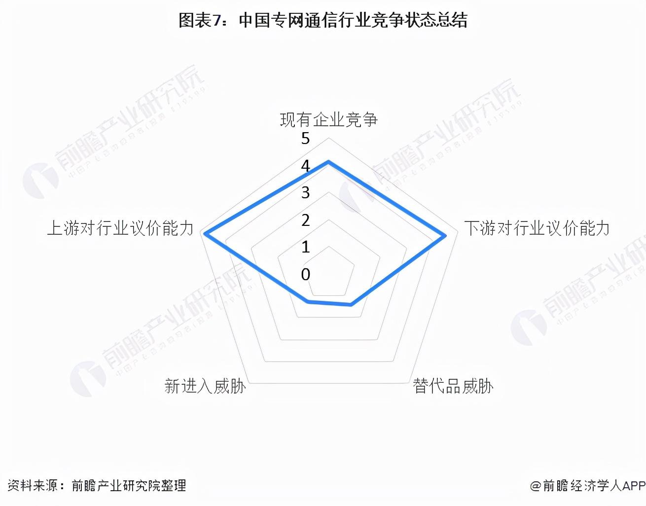 根据以上分析,对各方面的竞争情况进行量化,5代表最大,0代表最小,专网通信设备行业的竞争情况如下图所示。