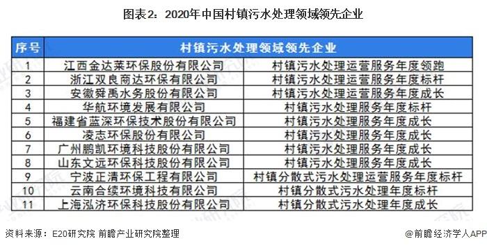 2020年,江西金达莱环保股份有限公司、浙江双良商达环保有限公司、安徽舜禹水务股份有限公司、华航环境发展有限公司、福建省蓝深环保技术股份有限公司、凌志环保股份有限公司、广州鹏凯环境科技股份有限公司、山东文远环保科技股份有限公司、宁波正清环保工程有限公司、云南合续环境科技有限公司和上海泓济环保科技股份有限公司入选“2020年村镇污水处理领域领先企业”榜单。