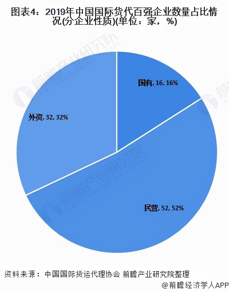 从百强企业不用性质企业数量占比来看,2019年国际货代百强企业中,民营企业有52家,国有或国有控股企业数为16家,外资(包括独资和合资)企业32家。结合营业额分布来看,民营企业的平均规模相对较小。