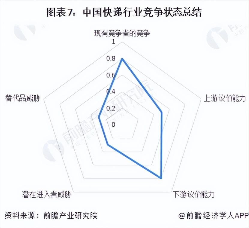 从五力竞争模型角度分析,由于快递服务具有特殊性,市场上很难有其他的服务能代替快递服务,顾客对该服务依赖性较强,因此,快递行业的替代品威胁较小;快递服务同质化严重,技术门槛低,较难实现差异化;再加上产业逐步趋于成熟,业务量增速放缓,快递行业的竞争程度异常激烈;上游供应商主要为运输车辆生产商、燃油供应商,为了降低成本、加强对车辆的管控力度,越来越多的快递公司用自有车辆来代替外部车辆,因此上游议价能力一般;快递服务同质化严重,差异性小,并且购买者的转换成本较小,压价能力较强,因此,下游议价能力较强;同时,随着头部企业在成本和服务端的不断优化,快递行业进入壁垒较高,潜在进入者威胁较小。