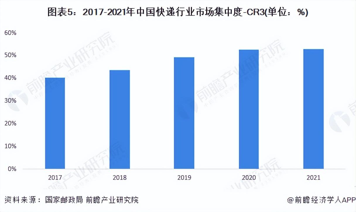 2017-2021年,中国快递行业市场集中度-CR3呈逐年上升的趋势,通达系内部竞争持续进行,综合实力具有优势的头部快递企业规模不断扩大,行业CR3持续提升,2021年行业CR3达到了52.9%。