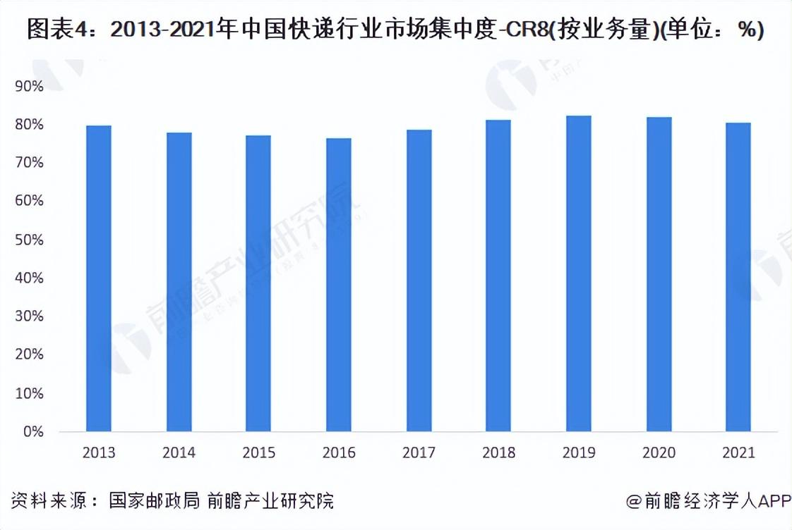 2013-2021年,中国快递行业市场集中度-CR8整体比较稳定,始终维持所在75%-85%之间。2021年,中国快递行业市场集中度-CR8为80.5%,较2020年下降了1.7个百分点。