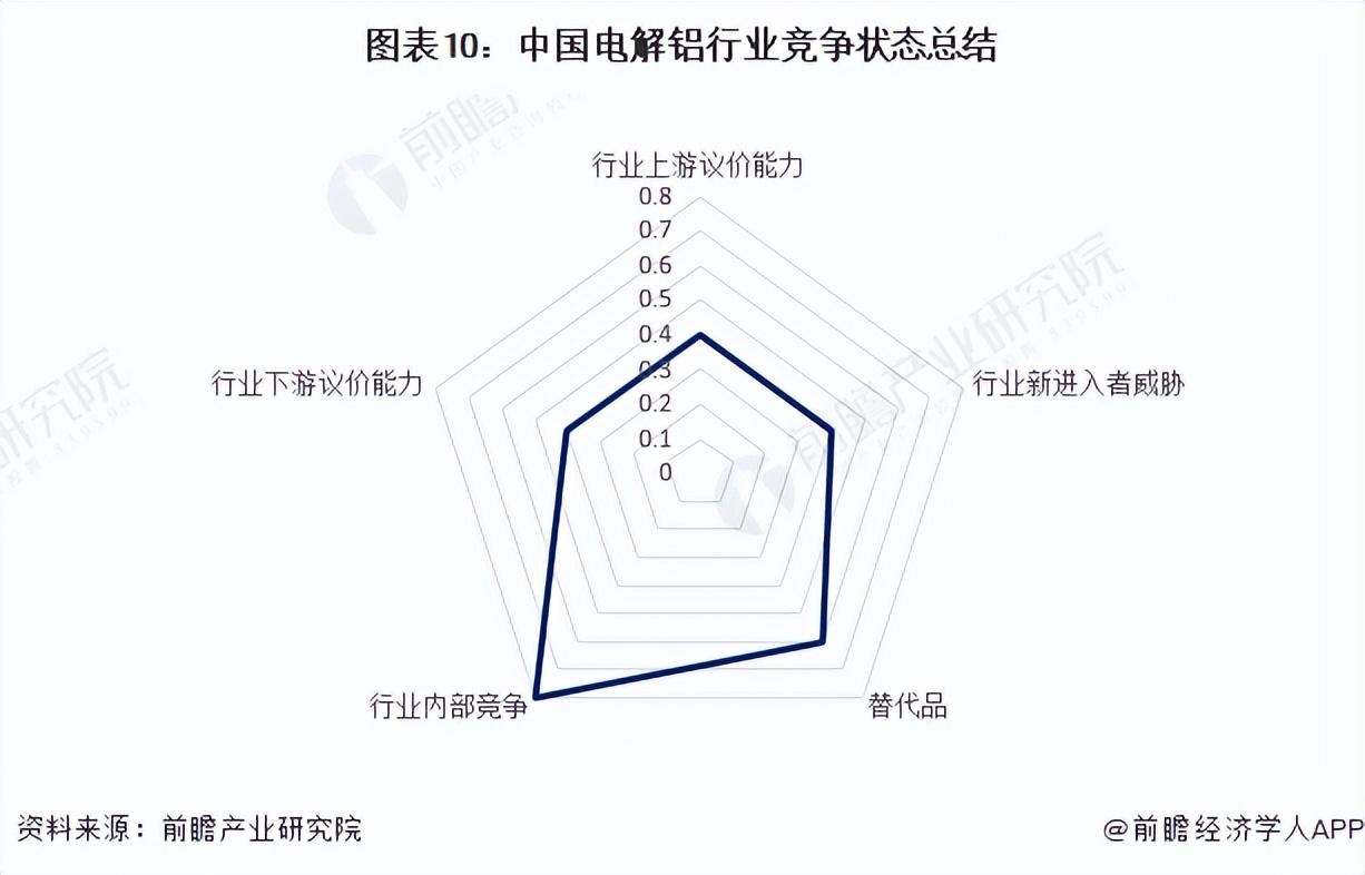 从五力竞争模型角度分析,目前,中国电解铝产品由于对环境影响较大,环境友好的再生铝为主要替代品,结合再生铝的优势与劣势,综合判断中国电解铝行业替代品威胁较大;中国电解铝行业现有竞争者数量较多,市场集中度较低;上游供应商一般为氧化铝、预焙阳极等原材料,中国电解铝企业后向一体化程度高,行业上游议价能力较低,而下游消费市场主要是建筑行业等,议价能力较弱;同时,因中国电解铝行业的资金门槛较高,同时还存在政策壁垒,潜在进入者威胁较小。