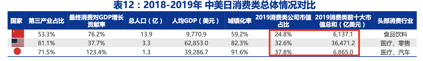 2)中国人口4倍于美国,三产占比、城镇化率、人均GDP与美日在缩小差距。但A股消费类公司市值 占比25%,美日平均在35%,A股前十大消费公司市值总和6137亿美金,仅为美国的17%。