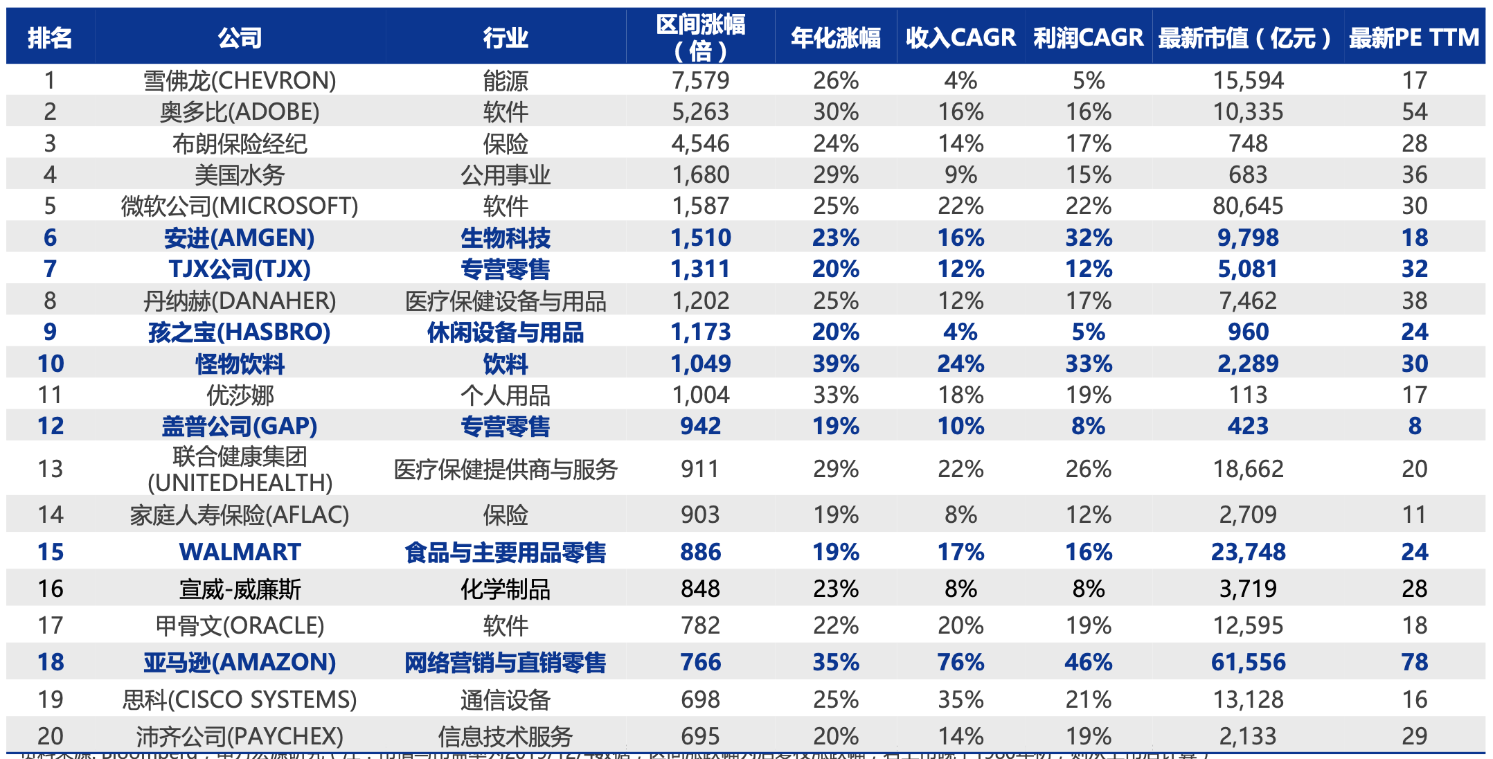 1980-2018年美股涨幅前20中有7家为消费类企业,行业分别为