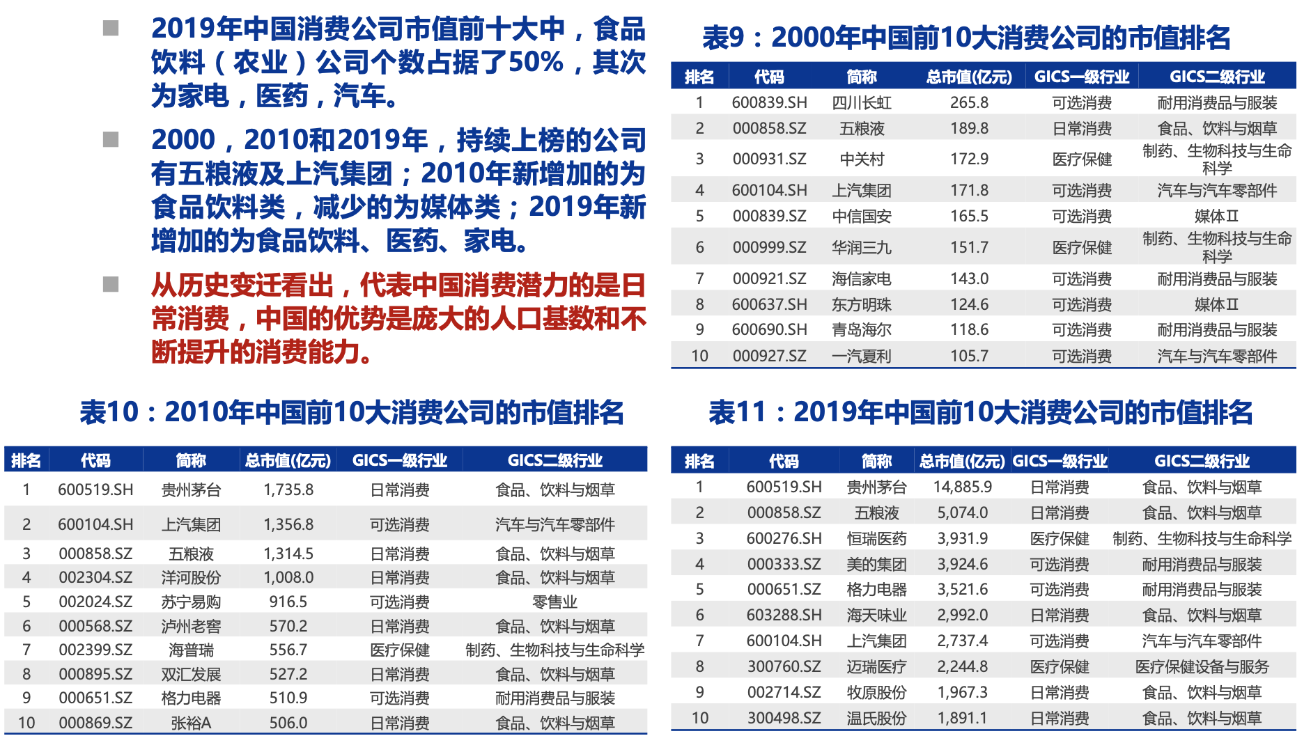 2)2000,2010和2019年,持续上榜的公司 有五粮液及上汽集团;2010年新增加的为 食品饮料类,减少的为媒体类;2019年新 增加的为食品饮料、医药、家电。