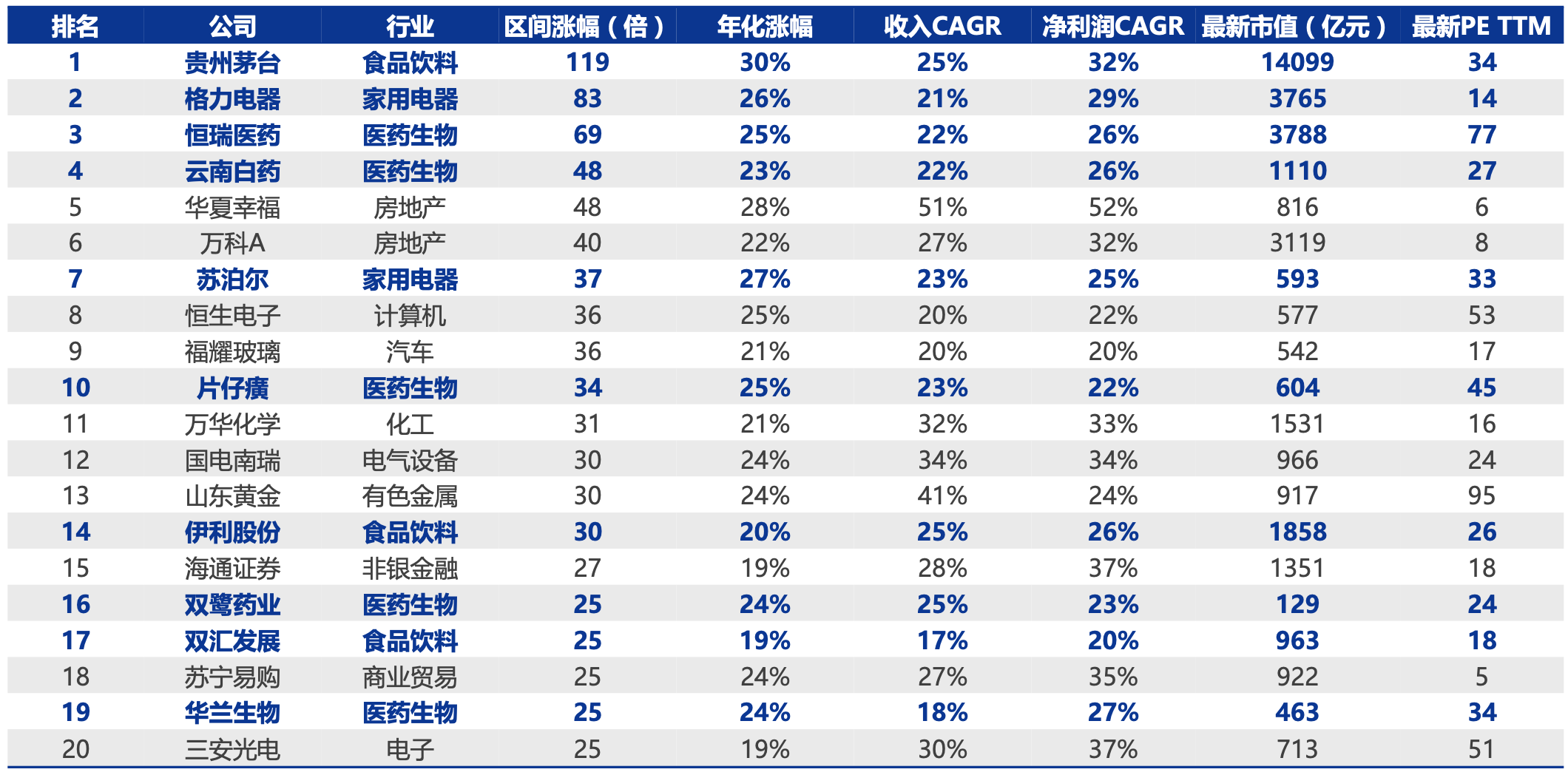 2000-2018年A股涨幅前20中有10家为消费类企业,行业分别是