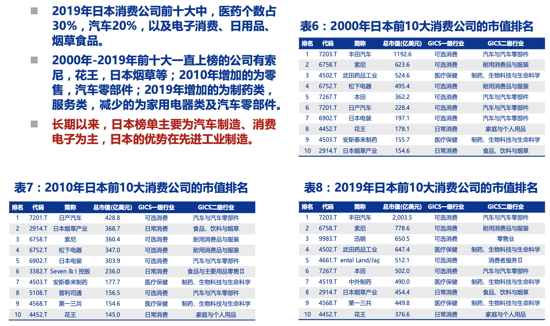 1)2019年日本消费公司前十大中,医药个数占 30%,汽车20%,以及电子消费、日用品、 烟草食品。