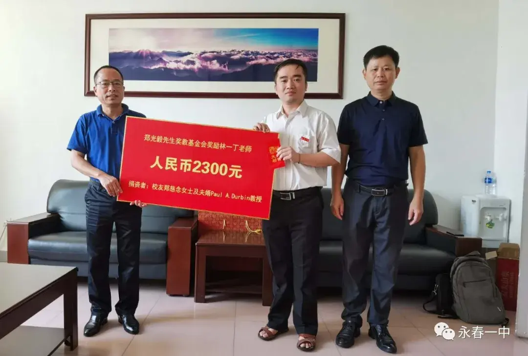 “郑光毅先生奖教基金会”是郑慈念女士和夫婿Paul A. Durbin 教授为回报母校培育之恩及纪念其先父郑光毅先生捐资起始金额二万美元而设立的。基金的起始本金永久保存,每年取基金利息,用于奖励品德优良、忠诚敬业、具有公认教学业绩的永春一中教师,促进永春一中教育事业的发展。