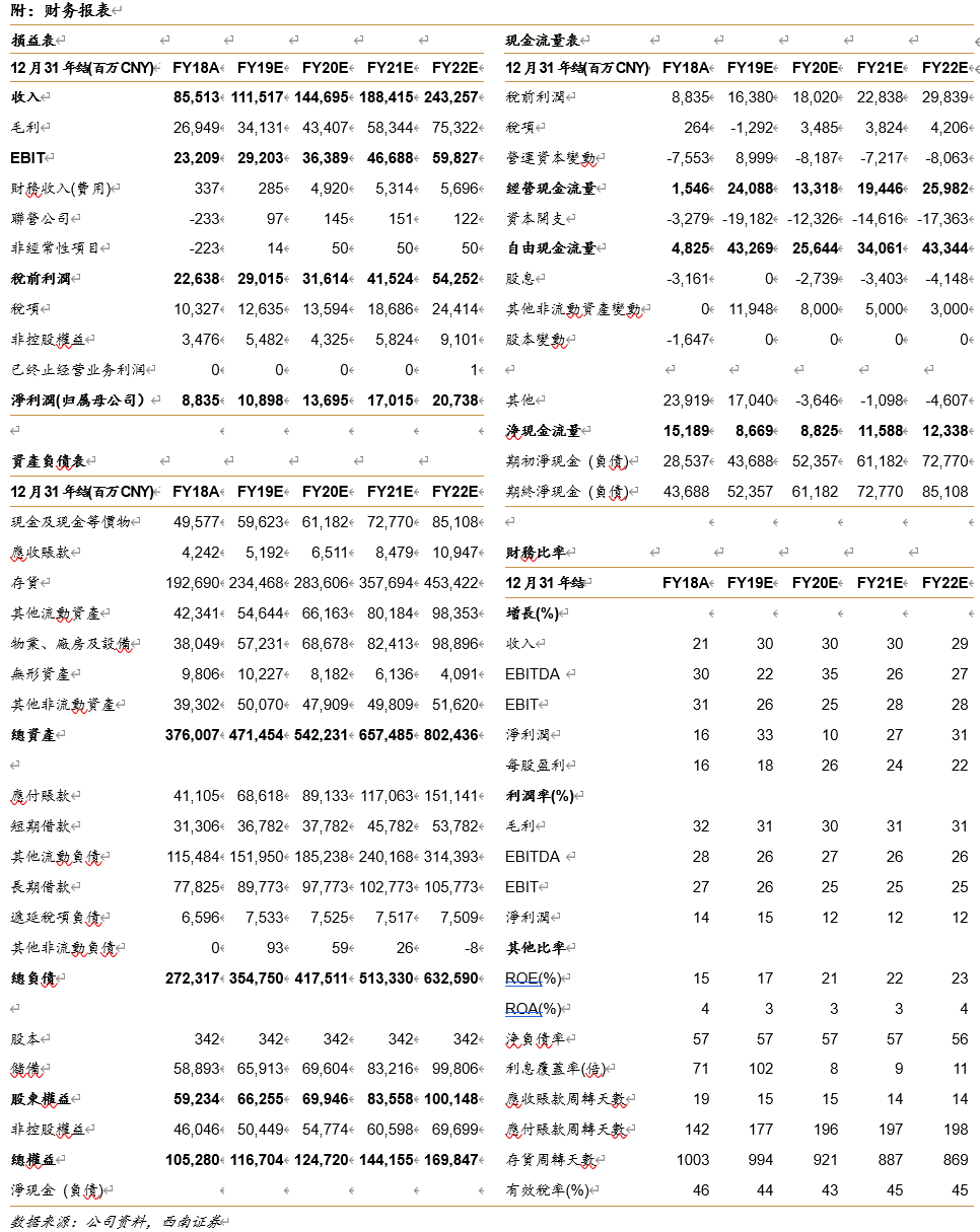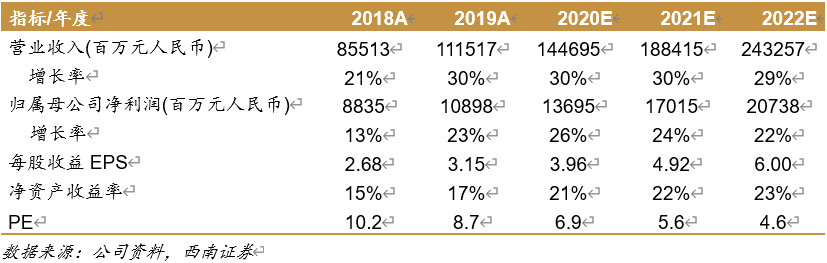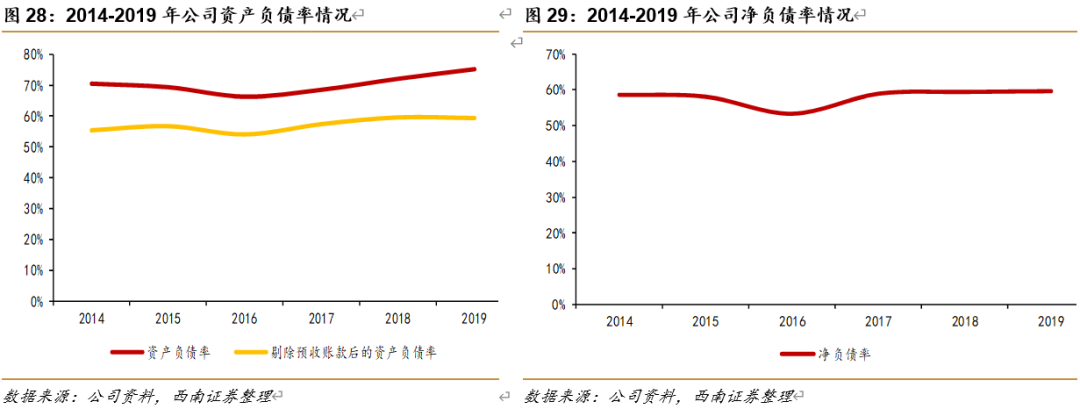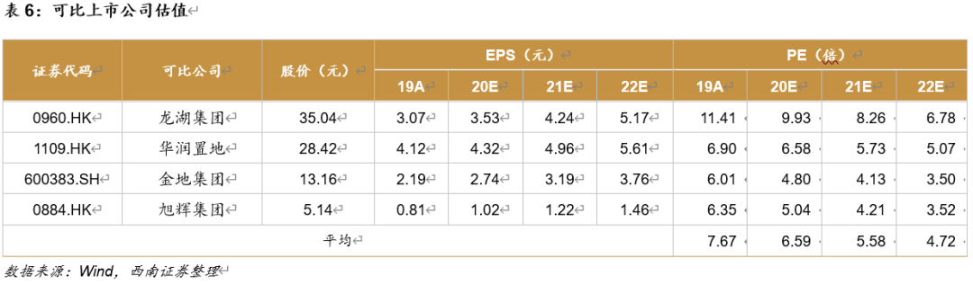 。公司净负债率连续8年位于60%以下,负债结构不断优化,加权平均融资成本下降至5.6%。2019年,穆迪上调评级至Ba1。2019年公司实现归母净利润首破百亿大关,销售毛利率为30.6%,基于公司优质的土储和销售单价的提升,未来毛利率大概率能维持在30%以上,另外考虑到公司高速的销售增长,公司盈利增长的确定性很强。