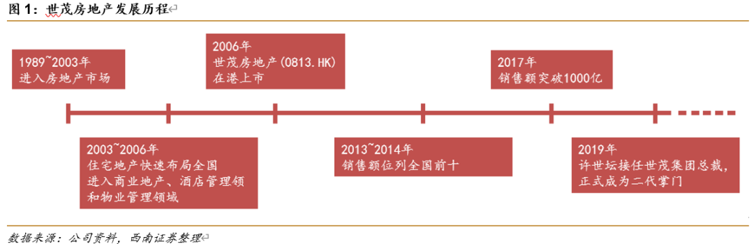 世茂房地产控股有限公司于1989年进入房地产行业,至今已有超过30年的发展历史。1999年,公司以世茂滨江花园在上海首创“滨江模式”,连续四年拔得上海住宅项目销售金额头筹。2003年,世茂进入福州,开启福建及海峡西岸经济区深耕。随后,世茂落子南京、杭州、苏州、武汉、烟台等城市,迅速将业务铺展向全国。同时,上海世茂广场投入运营,标志着公司业务拓展至商业地产。2006年,世茂房地产在香港联交所上市,公司进入资本规模化发展阶段。2009年,世茂酒店及度假村成立,全面负责世茂旗下酒店业务的经营、管理和发展。2011年,创始人许荣茂先生逐步将公司大权交给其子许世坛先生(2019年正式接任公司总裁),新一任管理层推动世茂进入高周转、加快去库存速度的新开发模式,同时将产品线从高端扩充至中高端,大大增加了客群基础。