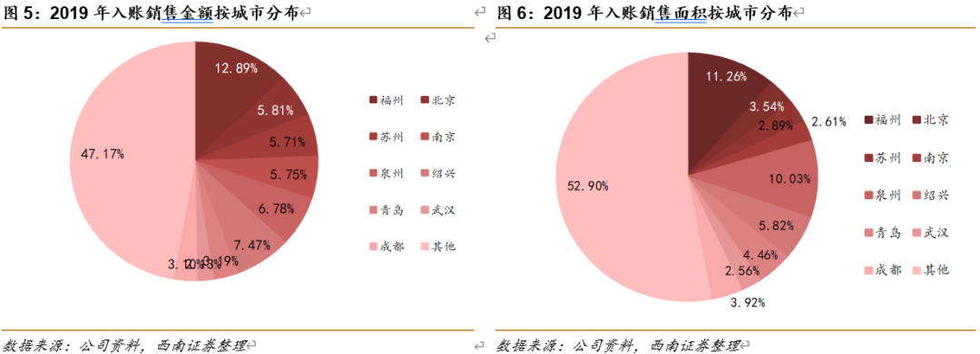 深耕福建地区,成效显著。世茂深耕十五年的福建地区,是世茂销售爆发式增长最突出的区域之一,世茂福建地区公司2019年销售金额稳居当地第一名。从销售结转贡献来看,福州市入账销售额高达135.73亿元(上年同期为80.50亿),占总额的12.2%;入账销售面积为79.07万平方米,占11.26%。