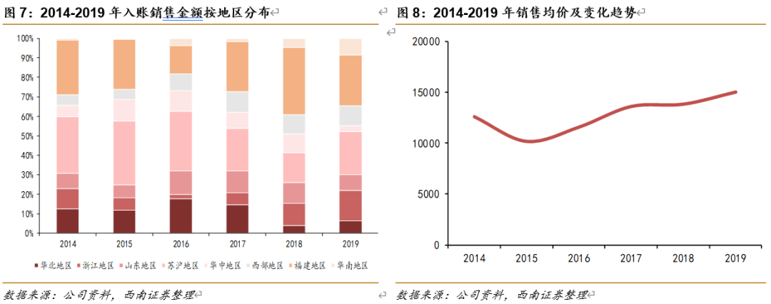各地区全面发力,苏沪地区成绩斐然。世茂自2003年始就走上了布局全国的发展道路,公司以苏州、南京、杭州、青岛、北京、武汉、成都、广州、深圳等重点城市为核心,逐渐辐射苏沪地区、浙江地区、山东地区、华北地区、中部地区、西部地区和华南地区,均取得了良好成绩。其中,又以苏沪地区的销售情况最为突出。2019年,苏沪地区共取得208.85亿元入账销售额,仅次于福建地区。从销售额贡献来看,福州、广州、杭州、北京、漳州、泉州均超过100亿。