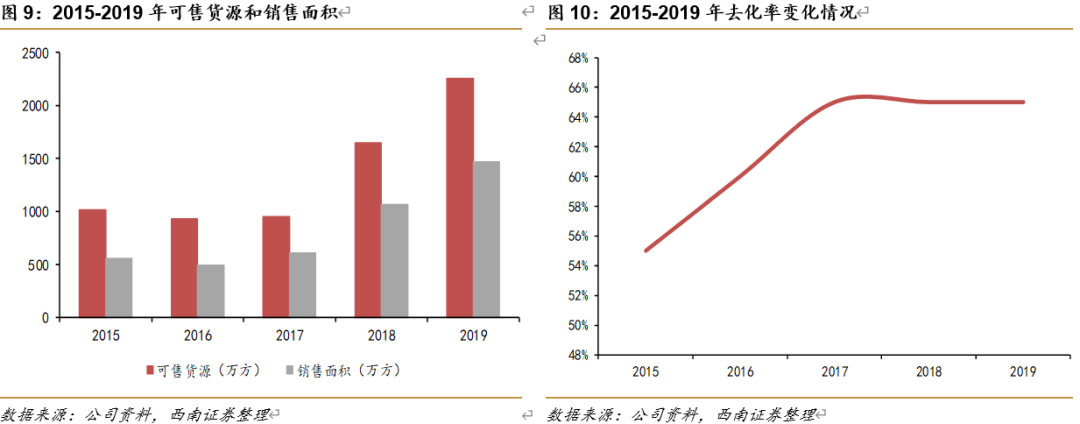 毛利率保持稳定,费用率维持低位。2019年,公司销售毛利率为30.61%,较2018末(31.51%)略微下降,但仍维持在30%以上的稳定水平。费用方面,2019年公司整体费率约2.73%,比2018年下降0.31个百分点,管理效能逐年提升,处于行业优秀水准,其中可售物业2019年费率约1.88%,同比2018年下降0.31个百分点,其费效水准居行业领先。
