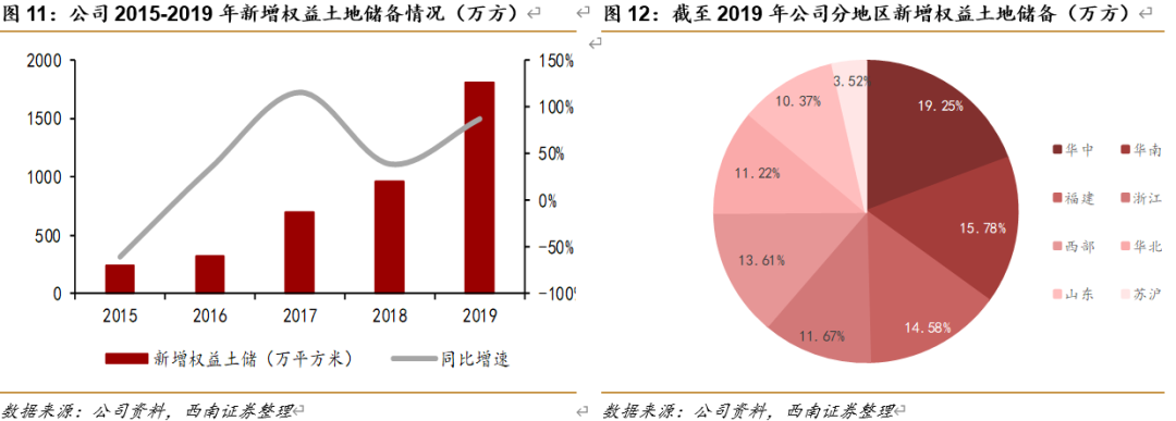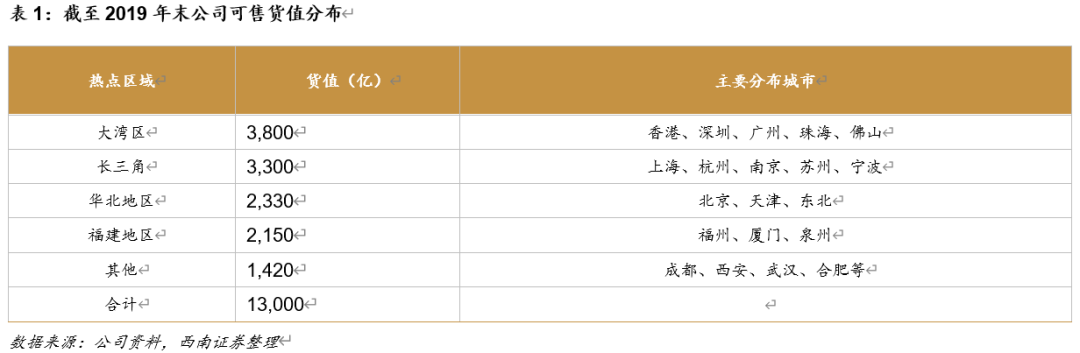 截止2019年底,公司权益前土储面积为7,679.42万方,同比增长38.66%;权益后土储面积为4718.80万方,同比增长26.66%。货值方面,截至2019年末,公司权益前土储货值超过13,000亿,主要分布在大湾区、长三角地区、华北地区和福建地区,未来销售可期。