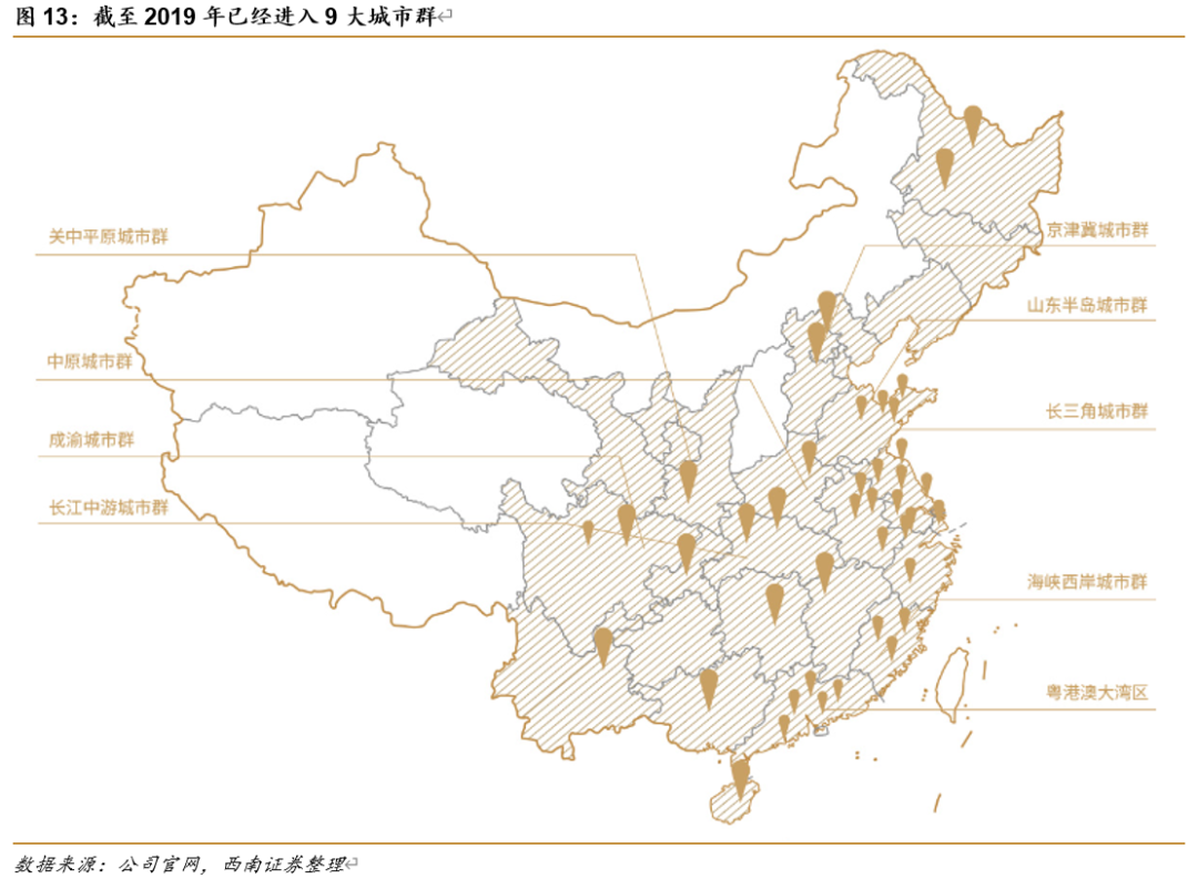 紧跟国家发展战略,深耕城市集群。长期以来,世茂聚焦具备国家宏观战略政策支撑、经济发展水平较高且需求旺盛的“红利区域”,积极参与了京津冀、山东半岛、长三角、海峡西岸、粤港澳大湾区、成渝等“核心城市群”的发展建设,在布局一二线城市同时,高度关注周边可承载外溢需求的三四线城市。比如,继布局杭州、宁波、绍兴、嘉兴后,公司2018年首入温州和台州,2019年又新进舟山,继续深耕杭州湾地区。目前,公司布局120个城市,一二线热点城市实现全覆盖,粤港澳大湾区、长三角和华北地区是主要土储区域。