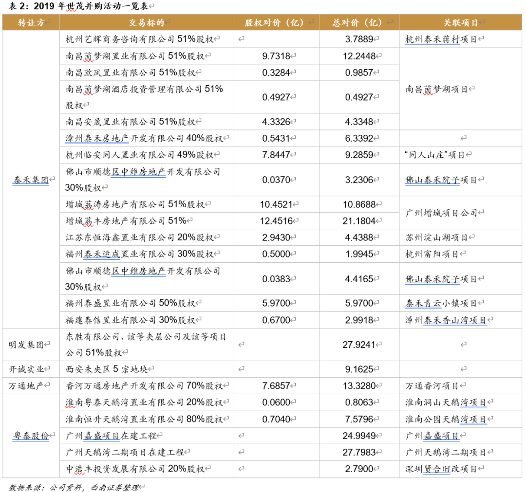近几年,在政策压力之下,房企生存环境恶化,一部分中小房企直接退出市场,一些前期比较激进的房企杠杆率较高,在市场下行周期不得已抛售项目以维持周转,这就孕育出了一波房地产行业并购整合的行情。而世茂凭借自身规模和资金优势,在并购市场上表现强势。据不完全统计,公司全年斥资超过200亿,从泰禾集团、粤泰股份、万通地产等企业手中收购逾20家项目公司,涉及18个开发项目。