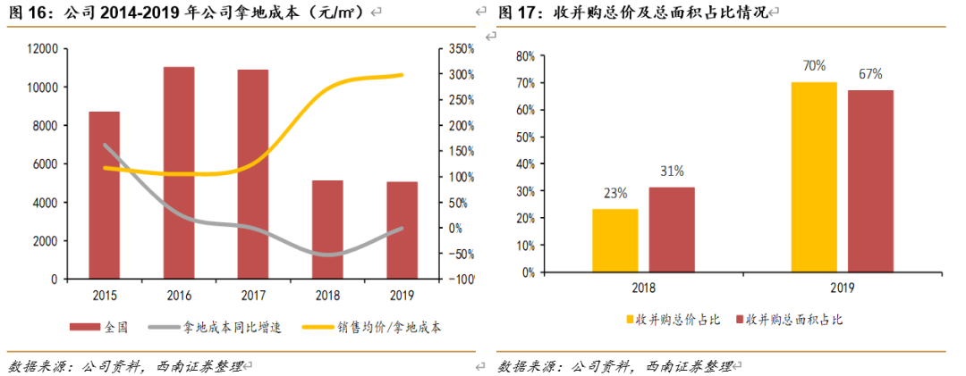 相比现阶段在一二线城市通过招拍挂的方式拿地难且成本难以控制,泰禾集团、粤泰股份等公司先前高价竞得的地块仍然有价格优势,世茂借此机会,以较低成本补充了大量一二线城市的优质土地储备。2019年,世茂公布的拿地成本为5035元每平米,同比下降1.26%,同期销售均价与拿地成本的比值也攀升至298%。19年新增的1,805万方的权益前建筑面积中,67%是通过收并购取得的,相比2018年有大幅提升。