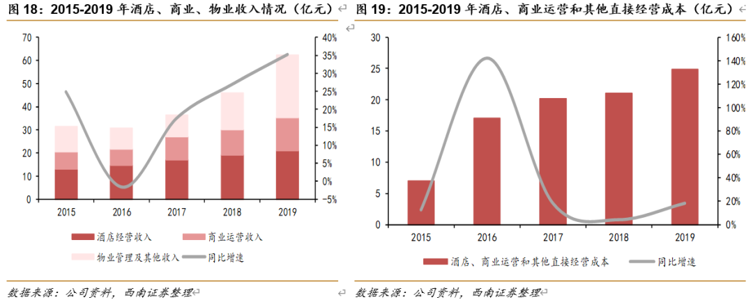 。世茂喜达酒店管理公司旗下拥有御榕庄、世御、睿选、凡象等7大定位不同的酒店品牌,在国内一二线城市及热门旅游景点,布局共90家酒店。2019年,世茂已开业的22家自持酒店实现收入20.97亿元,同比增长9.9%。世茂商业房地产已建立起“租售并举、多元协同”的商业模式和“4+2”产品管理体系,19年实现收入约14.28亿,同比增长30.9%。公司计划未来两年内,分拆酒店和物业管理业务上市。