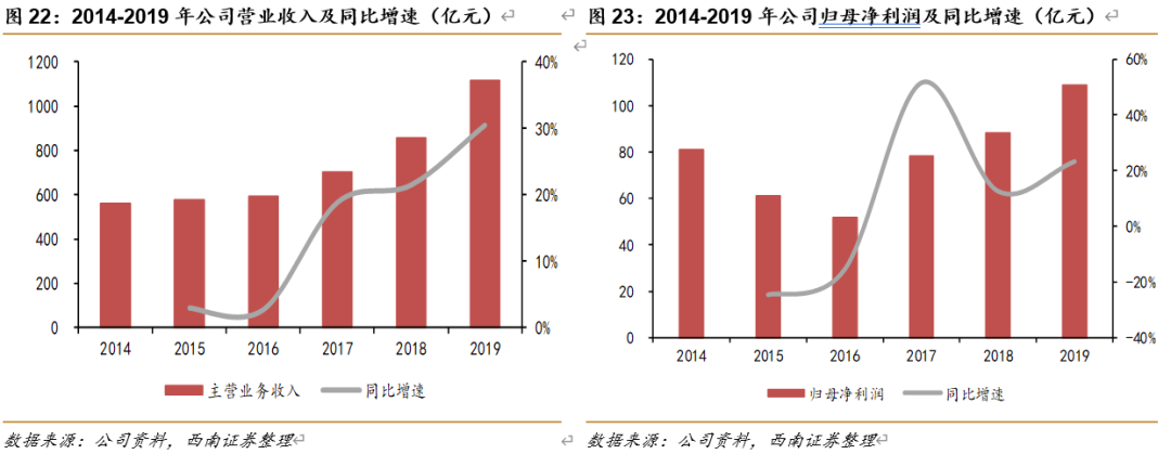 主营业务收入增长迅猛,盈利能力提升。2019年,公司主营业务收入达到1115.17亿,同比增长30.41%,增速较2018年提升10个百分点;归母净利润108.98亿,同比增长23.35%。2015-2019年,公司主营业务收入复合增长率为17.90%,归母净利润方面复合增长率为15.62%,平均增速颇受2015、2016年的拖累,2017年后开始强势表现。