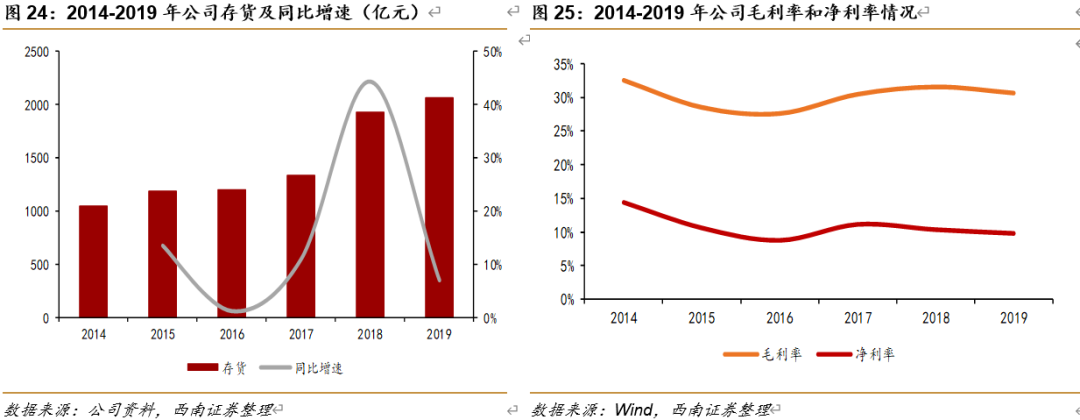 存货储备丰富。2017年以来,公司拿地频率明显加快,期末存货同比增速大幅提升。2017、2018两年年末的存货分别为1335.57亿、1926.90亿,同比增长10.98%和44.28%。2019年,公司存货值达2062.12亿,同比增加7.02%。