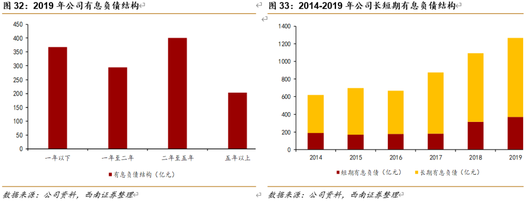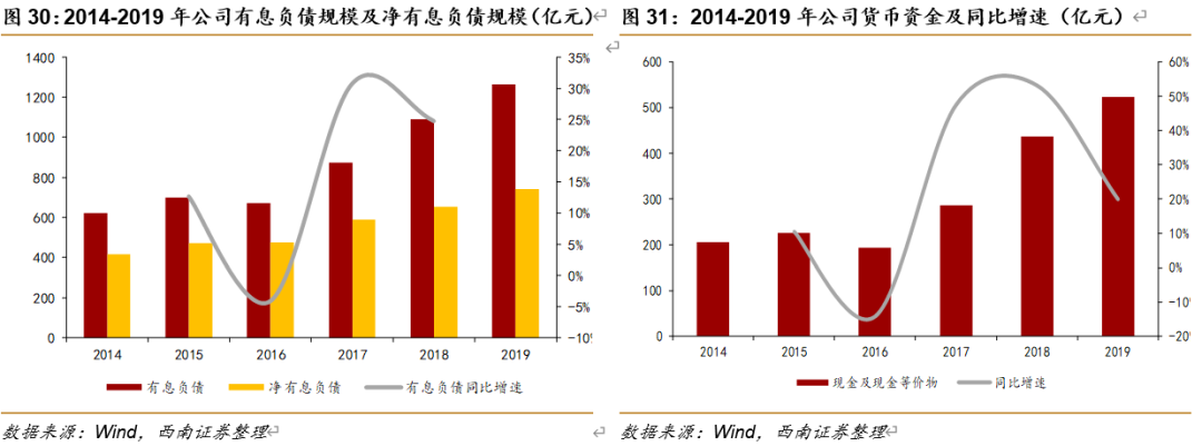 2014-2019年,公司有息负债规模和净有息负债规模都逐年增加,但增速有所放缓。2019年末,公司的有息负债余额为1265.55亿元,较2018年末提升15.97%。净有息负债从2017年的589.67亿小幅增长至741.98亿。另一方面,公司2019年现金及现金等价物的期末值为523.57亿元,同比增长19.84%,现金保持充裕,货币资金对短债的覆盖比波动上升,为公司的偿债能力提供了有力支撑。
