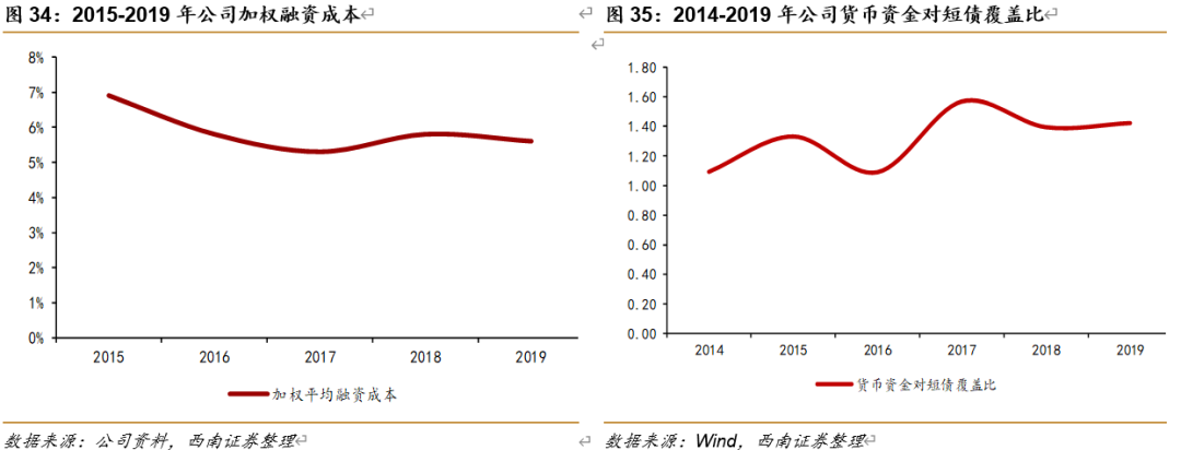 总的来看,2015-2019年,公司的加权平均融资成本缓步下降,目前处于5%~6%的区间中。2019年,该项指标为5.6%,相比2018年下降0.2个百分点,货币资金对短债的覆盖比高达1.42,反映出世茂优秀的偿债能力。