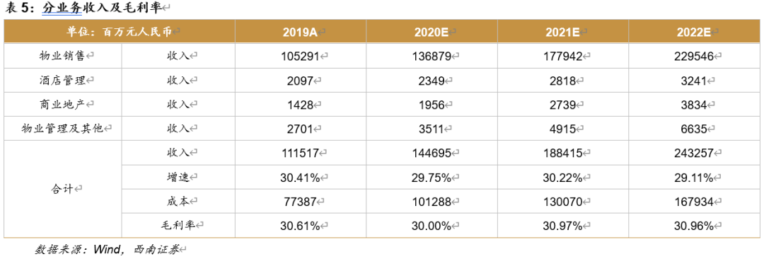 假设1:公司物业销售在2020-2022年的结转收入增速分别为30%、30%和29%,毛利率维持30%不变;