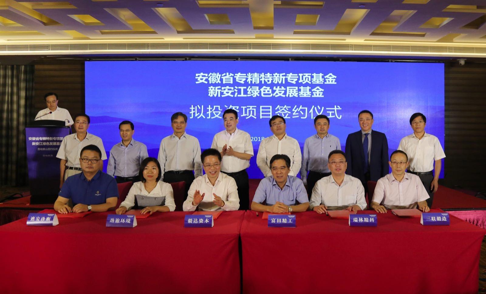 活动现场举行了安徽专精特新基金系列签约仪式,安徽省高新投、江苏高科技投资集团、黄山信投集团、黄山开投集团、万德创投、毅达资本等六家投资人共同签订了《基金合伙协议》;毅达资本与中国农业银行股份有限公司黄山分行签订了《基金托管协议》;毅达资本与富田精工、瑞林精科、劲旅环境、三联锻造、迪安诊断等5家企业签订了《基金拟投资项目协议》。