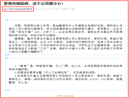 6月20日,崇义县市场监督管理局发布关于“简兑天衡”传销模式的预警。具体内容如下: