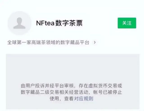目前这个项目官方公众号被封,近日,看到蓝鲸财经报道,“NFTea数字茶票”官方公众号被封,停用理由是“由用户投诉并经平台审核,存在虚拟货币交易或数字藏品二级交易相关经营活动”。