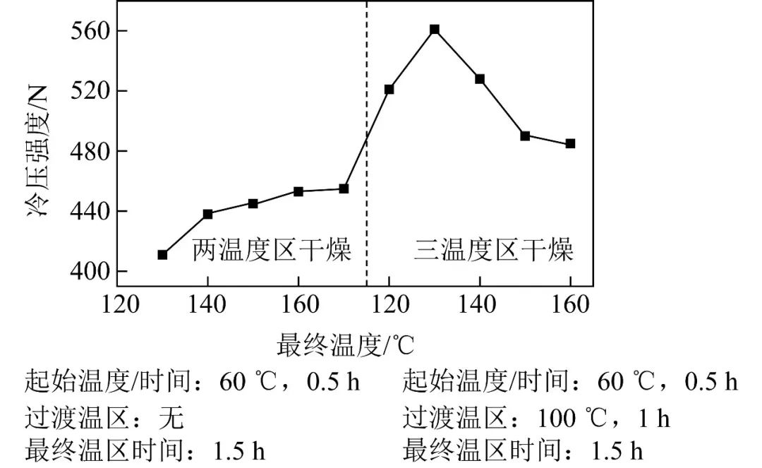2)热碎半焦型煤干燥采用三温区制度,避免了干燥温度跃升过快造成的型煤内外变形速率大和裂纹多等问题,其最优参数为初始60 ℃、过渡100 ℃、终温130 ℃,对应的干燥时间为0.5、1.0和1.5 h。