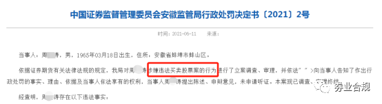 2021年6月11日,安徽证监局发布行政处罚决定书【2021】2号,对证券从业人员周某涛违法买卖股票行为进行了处罚。