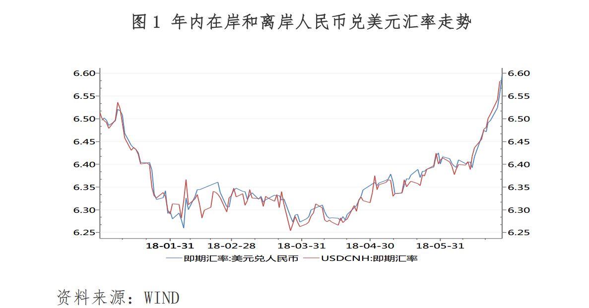 年内人民币汇率走势一波三折,大体分三个阶段,分别是稳定升值、小幅贬值和快速贬值阶段。第一阶段从年初至4月19日,即期汇率从6.4967升至6.2778,升幅3.5%。第二阶段从4月20日至6月14日,在此阶段,人民币汇率从6.2898贬至6.3923,贬值幅度1.6%。第三阶段从6月15日至6月27日,短短8个交易日,即期汇率从6.4168跌至6.5950,跌幅2.7%,离岸汇率贬值幅度达到2.6%,在岸和离岸汇率盘中曾一度突破6.6(图1)。第二、三阶段合计,两个多月里在岸和离岸汇率分别贬值4.6%和5%,贬值幅度和速度堪比2015年和2016年。