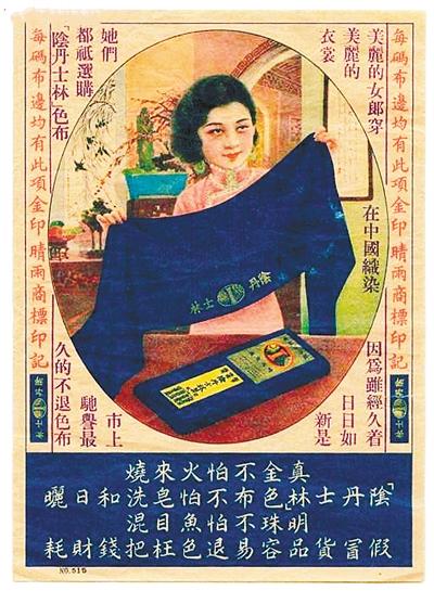 还有一张民国“晴雨”牌阴丹士林布头上的广告单页也很有意思。民国时期,阴丹士林布曾风靡一时,摩登的太太们用它来做旗袍,素朴的女学生们拿它来做校服。在各色阴丹士林布中,山东潍坊大华染织厂机染的“晴雨”牌商标名气最大,行销大江南北,在全国布匹市场中,可视为翘楚。为了防止其他商家假冒,大华染织厂在每匹布的布头贴上“阴丹士林染色布”和“晴雨”商标的广告单页,以此识别产品的真伪。只见这张单页的正中,一个戴珍珠项链,烫着爱司头的摩登女子举着一块阴丹士林蓝色布。单页的上方还有“美丽的女郎穿美丽的衣裳她们都只选购阴丹士林色布”“在中国织染 因为虽经久着 日日如新 是市上驰誉最久的不退色布 ”的宣传语。单页的左右两侧均印上“每码布边均有此项金印 晴雨商标印记”。“晴雨”商标由上海漫画界大腕级人物张乐平设计。商标为椭圆形,左侧是太阳,右侧是云和雨,中间画的是红柱,既是“晴雨”天气的体现,又表明其产品品质,不怕日晒雨淋,永不褪色;图案两侧是“阴丹士林”四个字,下侧是“晴雨商标”四个字。单页的下方还有“真金不怕火来烧 ‘阴丹士林’色布不怕皂洗和日晒”“明珠不怕鱼目混 假冒货品容易退色枉把钱财耗”这两句对比鲜明的广告语。孰优孰劣,可谓一目了然。